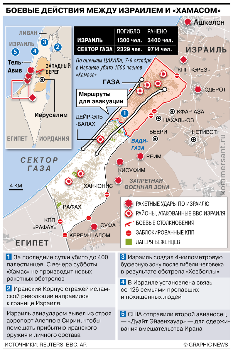 Ход боевых действий и эвакуации Армия Израиля нанесла удары по территории Ливана, откуда движение «Хезболла» обстреляло поселение Штула. Военные закрыли доступ к территориям до 4 км от северной границы из-за обстрелов. ЦАХАЛ на три часа открыл гуманитарный коридор для выхода мирных жителей из северной части сектора Газа и города Газа. Премьер-министр Израиля Биньямин Нетаньяху и президент США Джо Байден согласовали решение возобновить подачу воды в южной части сектора Газа. За неделю в Газе переместили почти 1 млн человек, заявили в ООН. Город Сдерот в районе Газы покинули примерно две трети жителей. «Хамас» готов освободить пленных в обмен на прекращение бомбардировки Газы, пишет Finanсial Times со ссылкой на источник. Израиль отложил проведение наземной операции в секторе Газа в выходные из-за погодных условий, утверждают источники The New York Times. США отправили в Восточное Средиземноморье второй авианосец для сдерживания «враждебных действий против Израиля». Аэропорты Алеппо и Да