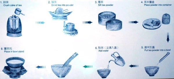 В текстах династии Тан (608-960 гг.) способы изготовления, приготовления и питья чая, описываются следующим образом: