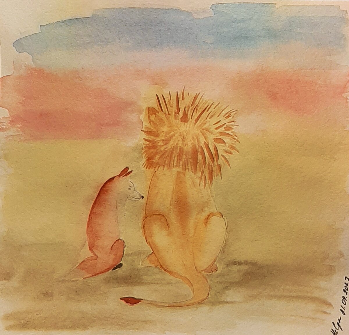 Она шла всё медленнее и всё ближе к его большому теплому боку. Он почувствовал её тепло и решился обнять её. Она с благодарностью посмотрела на Сильного Льва, принимая его заботу. «Холодное утро», - смущенно сказал Лев и Лиса ободряюще кивнула ему и улыбнулась