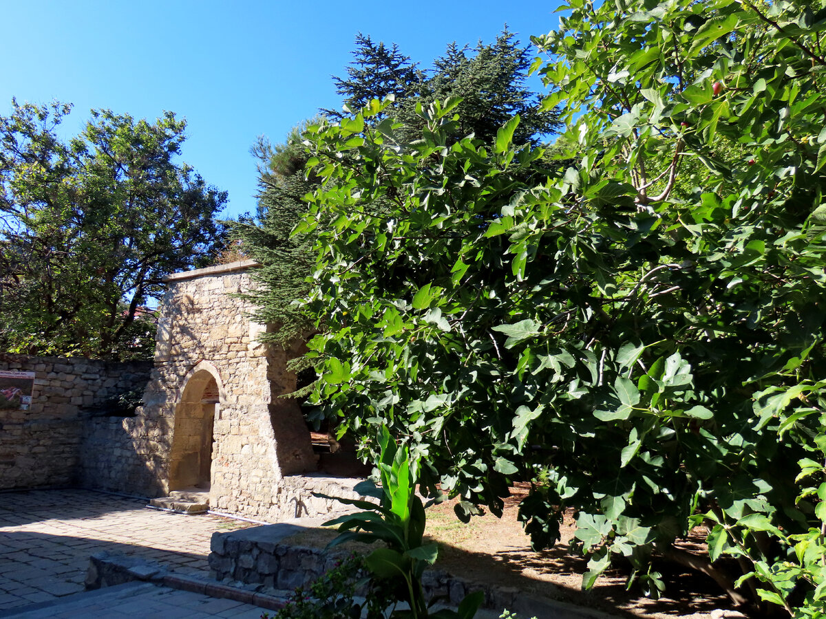 Как-то в середине октября мне надо было в город по делам. Дела сделались быстро. И решила немного пройтись, поискать у нас в городе золотую осень. Ведь все выкладываю! А у некоторых уже снег был! Первым в голову пришел, конечно же, в сквер Айвазовского! Зима у меня там есть. В этом году и весну красивую поймала в нем. Пойду за осенью! Пока шла по бульварам, закралось у меня смутное сомнение, что я как-то поторопилась с поисками желтой листвы! Да и ладно. Гуляем! И вот он сквер. Конечно же, весь зеленый. Об осени даже и не думает. Но он смог меня удивить! Прямо по главной дорожке растет инжир! Сколько раз я тут была, а его не видела! И какой красивый! И не просто растет, а еще и инжиринки на нем доспевают! Это фиолетовый сорт, он более поздний. У древних стен! В голове сразу построились слова в рядок – Церковь, Древность, Адам, Ева… И назвала я это дерево Библейским инжиром. Ведь растет у святых стен! И сколько эти стены помнят! Если кто захочет почитать про этот сквер и его