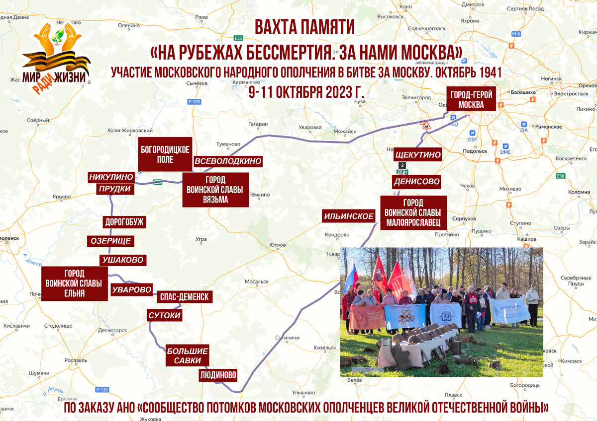 Участие московского народного ополчения в битве за Москву. Октябрь 1941 9-11 октября 2023 г. Уже не первый раз проводит Фонд «МИР РАДИ ЖИЗНИ» в рамках Программы Памяти Московского народного ополчения, реализуемой Мосгордумой и АНО «Сообщество потомков Московских ополченцев Великой Отечественной войны», трехдневную Вахту Памяти по Ржевско-Вяземской линии обороны октября 1941 г.