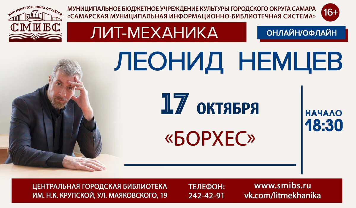 Что готовит нам грядущая неделя. Мой выбор 17 октября, вторник Центральная городская библиотека имени Н. К. Крупской, 18:30 16+ Борхес Лекция литературоведа и прозаика Леонида Немцева в рамках цикла «Лит-механика» 18 октября, среда Центральная городская библиотека имени Н. К. Крупской, 18:30 16+ Приключения вопросов и ответов Лекция литературоведа, культуролога, киноведа Валерия Бондаренко в рамках цикла «Серебряный век: поиск утраченной целостности» 18 октября, среда Kowalski Club, 19:00 16+ Лаокоон – старый и новый, или История о том, как авангард боролся со словом Лекция философа и киноведа Олега Горяинова в рамках цикла «Приключения образа в эпоху модерна» 19 октября, четверг Археологический центр Музея Алабина, 18:00 6+ Открытие выставки, подготовленной государственным историко-архитектурным и художественным музеем-заповедником «Остров-град Свияжск» (Республика Татарстан) с использованием подлинных археологических предметов из фондов Музея Алабина Мокрая археология Археологичес