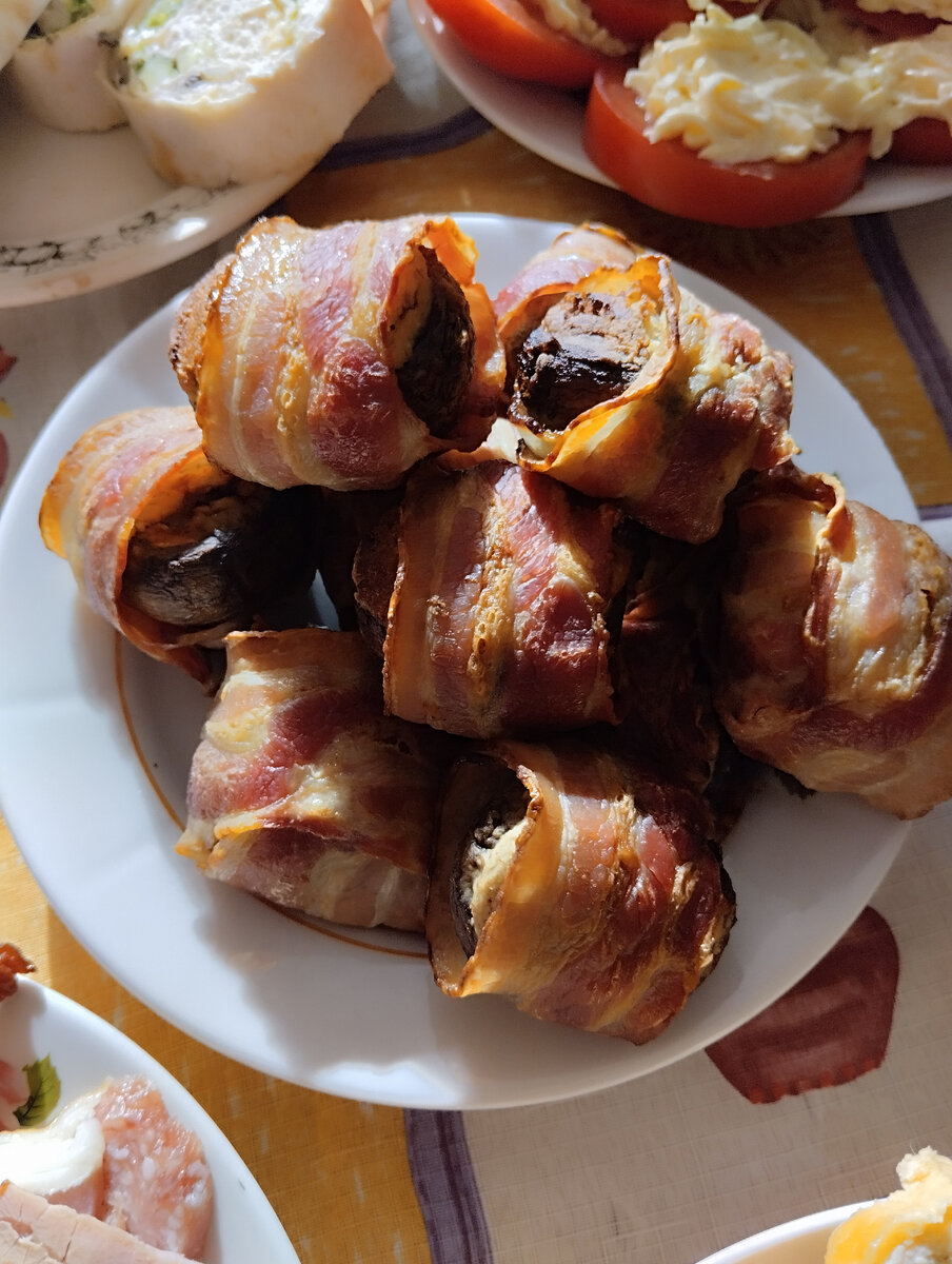 Это рецепт очень быстро и легко готовится, а на столе смотрится красиво. Нам понадобится: 12 шт. больших шампиньонов; 100гр. отварной курицы; 100гр. майонеза; Бекон 12 слайдов; 1 плавленый сырок. У шампиньонов отламывает ножки и обжариваем ножки с луком, а шляпки отвариваем 10 минут. Затем смешиваем в блендере сырок, курицу и шампиньоны. Добавляем майонез и перемешиваем до однородной массы. Начинаем шампиньоны. Приблизительно 1 чайная ложка начинки на одну шляпку. Заворачиваем шляпки в бекон. И отправляем в аэрогриль на 25 минут при температуре 220 градусов. Бекон запекается, а шампиньоны получаются мягкими и сочными. Приятного аппетита!