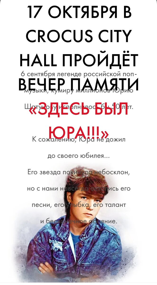 В честь 50-летия Юры Шатунова (06.09.23г.), Можно было зайти на сайт, выбрать любое место и купить билет. Билеты были от 1000 рублей на балкон. Но их быстро раскупили. И как видно, на 3 сентября билетов было много. На сегодня, 15 октября, это всё что осталось. Организаторы концерта решили порадовать поклонников и зрителей и сделали специальную цену на 100 билетов в партер, по 7500 рублей! Круто!!! Сейчас билеты остались от 7,500 ₽. до 35,000 ₽. А тем кто не сможет побывать на этом трибьют-концерте, будем надеяться, что его запишут, и все смогут его увидеть по ТВ или в интернете. На вечере - памяти Юры Шатунова примут участия артисты: Они исполнять наши любимые песни, хиты Юры Шатунова. И все участники вечера в честь 50-летия Юры выступят бесплатно. Ведущие вечера - Лера Кудрявцева и Андрей Малахов. P.S: Только очень жаль, что из этих артистов НИКТО не пришёл на похороны Юры!.. А сейчас как вороньё слетелись на звёздное имя - Юра Шатунов (!) Это ещё одно из доказательс