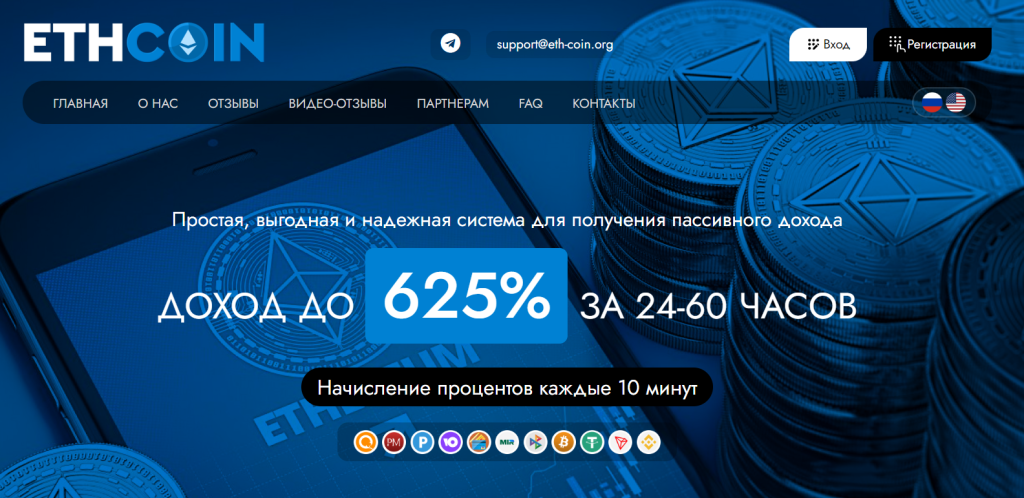 В мире криптовалют и инвестиций существует немало обещаний «легких» заработков, но проект ETH COIN выходит за пределы всех ожиданий. С заявленным доходом до 625% за 24-60 часов и начислением процентов каждые 10 минут, он кажется слишком хорошим, чтобы быть правдой. В этой статье мы рассмотрим проект ETH COIN, раскроем его суть и расскажем, почему стоит подходить к нему с крайней осторожностью, а возможно, и вообще избегать. Информация о проекте ETH COIN 1. Нереалистичные обещания: Проект обещает инвесторам прибыль в размере от 138% до 625% всего за 24-60 часов, с начислениями процентов каждые 10 минут. Эти обещания кажутся чрезмерно завышенными и нереалистичными для любой легитимной инвестиционной схемы. 2. Отсутствие прозрачности: Нет никакой информации о том, кто стоит за проектом. Неизвестные создатели и отсутствие документов или лицензий делают его деятельность подозрительной. 3. Короткий срок работы: Проект заявляет, что работает всего 9 дней, что вызывает вопросы о его долгосроч
