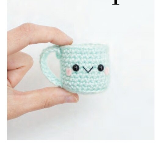 Из книги "100 дней амигуруми". День 15 Напитки покрепче: Перевод: Вязальные приключения Условные обозначения: КА - кольцо амигуруми ВП - воздушная петля СБН - столбик без накида ПССН - полустолбик с накидом ССН - столбик с накидом УБ - убавка ПР - прибавка Материалы: Чашка Вяжем пряжей мятного цвета 1 ряд: 5 сбн в КА (5) 2 ряд: 5 ПР (10) 3 ряд: (1 сбн, ПР)*5 (15) 4 ряд: (2 сбн, ПР)*5 (20) 5 ряд: (3 сбн, ПР)*5 (25) 6 ряд: за заднюю полупетлю 25 сбн (25) 7-14 ряды: 25 сбн (25) Закрепить и спрятать нить. Вставьте глаза между 5 и 6 рядами (считая от края), на расстоянии 3 петли друг от друга. Вышиваем рот. Если вы приклеиваете щеки из фетра, сделайте это сейчас. Ручка Используйте мятную пряжу. 14 вп, затем со 2-ой петли от крючка, ПССН в каждой петле (13) Закрепите и оставьте длинный конец для пришивания. Пришейте ручку к чашке прямо над краем (ряд 6). Пришейте загнутую часть ручки к чашке. Закрепите и отрежьте нить. Кофе Используйте коричневую пряжу 1 ряд: 5 сбн в КА (5) 2 ряд: 5 ПР (10