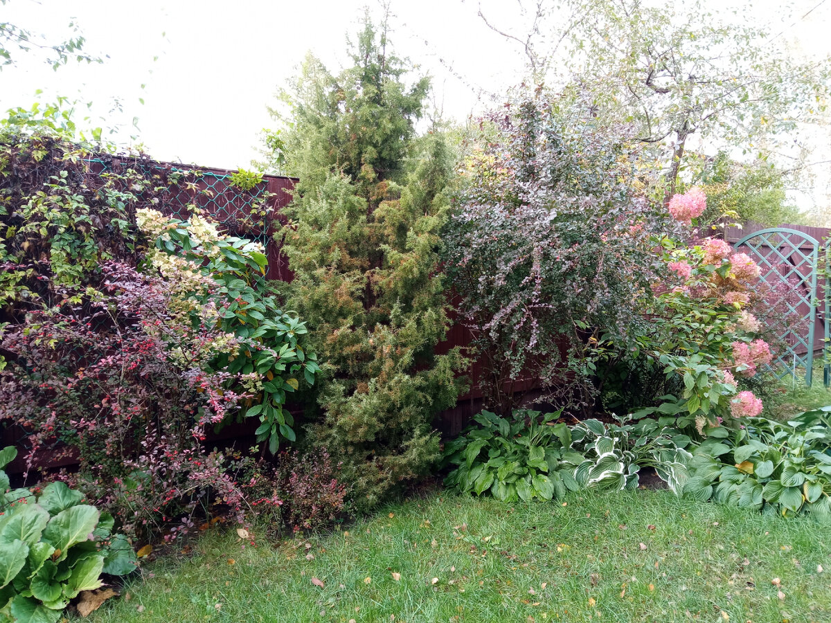 Про цветник, который получил название Барбарисовой комнаты, я уже писала. Как выглядит этот цветник весной и летом, можно посмотреть в статьях выше. А сейчас я хочу показать его осенний облик. Конечно, середина осени - не самое лучшее время для фотосессии, но и состояние увядания может иметь своё очарование. Четыре барбариса, можжевельник и две гортензии метельчатых - основные жители этой комнаты. Центром композиции является можжевельник обыкновенный. Из-за длительного отсутствия осадков он немного пожелтел. А я вовремя этого не заметила, стала поливать его слишком поздно. После недели дождей почва увлажнилась, но я не уверена, что он простит мне мой недосмотр. Барбарис Тунберга "Арлекин" - левый фланг композиции. Он частично уже сбросил листву, поэтому его ярко-красные ягоды стали заметнее. Бадан на фоне пунцовых листьев соседа кажется ещё зеленее. А недавний дождь добавляет ему глянца. Самый высокий барбарис в цветнике - тёмно-пурпурная форма барбариса обыкновенного. Он ещё не