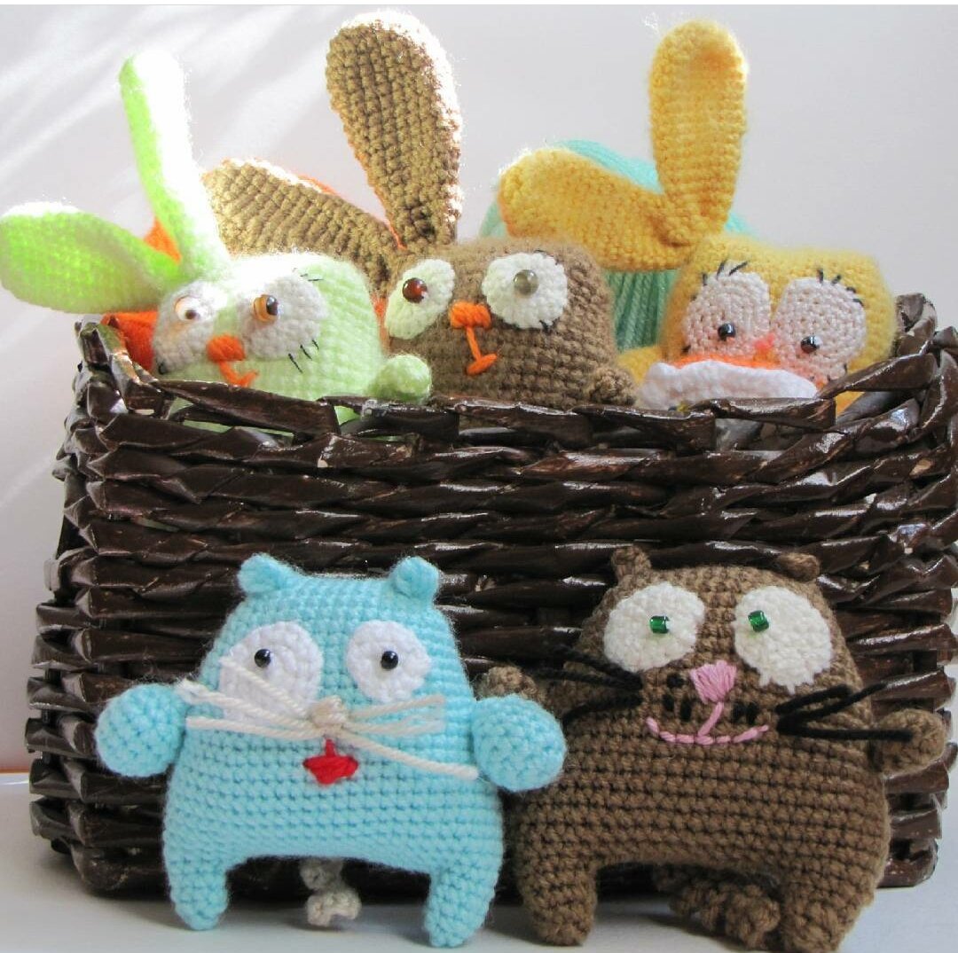 Сегодня я хочу немного рассказать про вязаные игрушки крючком. Их сейчас очень много, от совсем простеньких примитивов до интерьерных за много денег. Которые не для игры а для.... Ну, кому для чего. Для души, для красоты, для коллекции... Игрушки, фото которых я сейчас выставляю, не все связаны мною. Был у меня с приятельницей и тезкой в "декретное" время небольшое совместное предприятие (рога и копыта)))). Вначале были вот такие простенькие зайчики и котики по описаниям от Марины Чучкаловой. Вполне неплохие игрушки для маленьких детей. Если глазки просто вышить, что бы никаких мелких бусинок. И усы вышить. И можно играть, можно в рот толкать, можно кидать и прятать. Все безопасно - оторваться нечему. Затем такой яркий щенок. Это уже работа посерьезнее, для детей постарше. С ним играют, носят на прогулку, в садик, укладывают спать рядом. Его кормят, лечат, купают. Обнимают и ставят в угол ))) Заметили? На фото два разных собакена. А здесь ужасно милые, мягкие и тискательные овечки.
