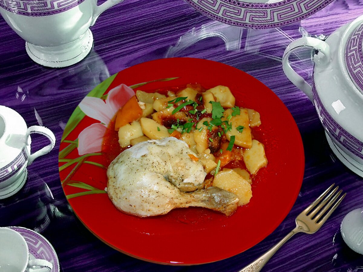 Рецепт для мультиварки-скороварки в Oursson-5005. Но это блюдо можно готовить в любой мультиварке или скороварке. Продукты Курица - 1,4 кг Картофель - 800 г Лук - 1 шт. Перец болгарский - 1 шт. Помидор - 1 шт. Приправа для курицы Соль Чеснок Кетчуп - 2 ст. л. Приготовление 1. Курицу разрезать вдоль грудки. Под кожу положить нарезанный чеснок. Натереть солью и приправой. 2. Нарезать овощи. Выложить на дно чаши помидор. 3. Картофель смешать с луком. Добавить кетчуп, немного посолить. 4. Перемешать и положить в чашу. 5. Положить перец. 6. Сверху уложить курицу. 7. Установить программу «Выпечка» на 1 час (отсчёт времени от «Старта»), давление 1. В других мультиварках использовать эту же программу, увеличив время до 1 ч 30 минут, а в скороварках будет достаточно 25 – 30 минут. 8. После сигнала блюдо готово. 9. Разрезаем курицу на части и подаём вместе с овощами, с которыми она тушилась. Другие рецепты блюд с курицей: