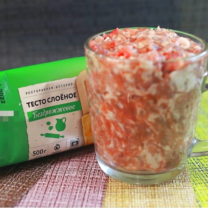 - на раскатанный лист выложить треть приготовленной мясной начинки, разровнять тонким слоем;