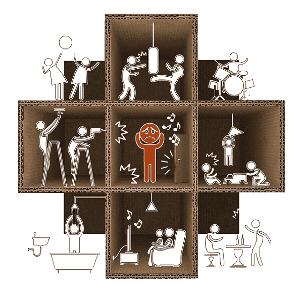 - Шум из смежных квартир – поступает через стены, сквозные розетки и щели между плитами перекрытия. Шум от соседей, является самой частой причиной желания произвести звукоизоляцию квартиры. Если источник постоянного раздражающего шума один, то достаточно произвести звукоизоляцию смежных с источником стен. Если же вам не повезло, и шумные соседи окружают вас со всех сторон, то в этом случаи, придётся делать полную звукоизоляцию квартиры;