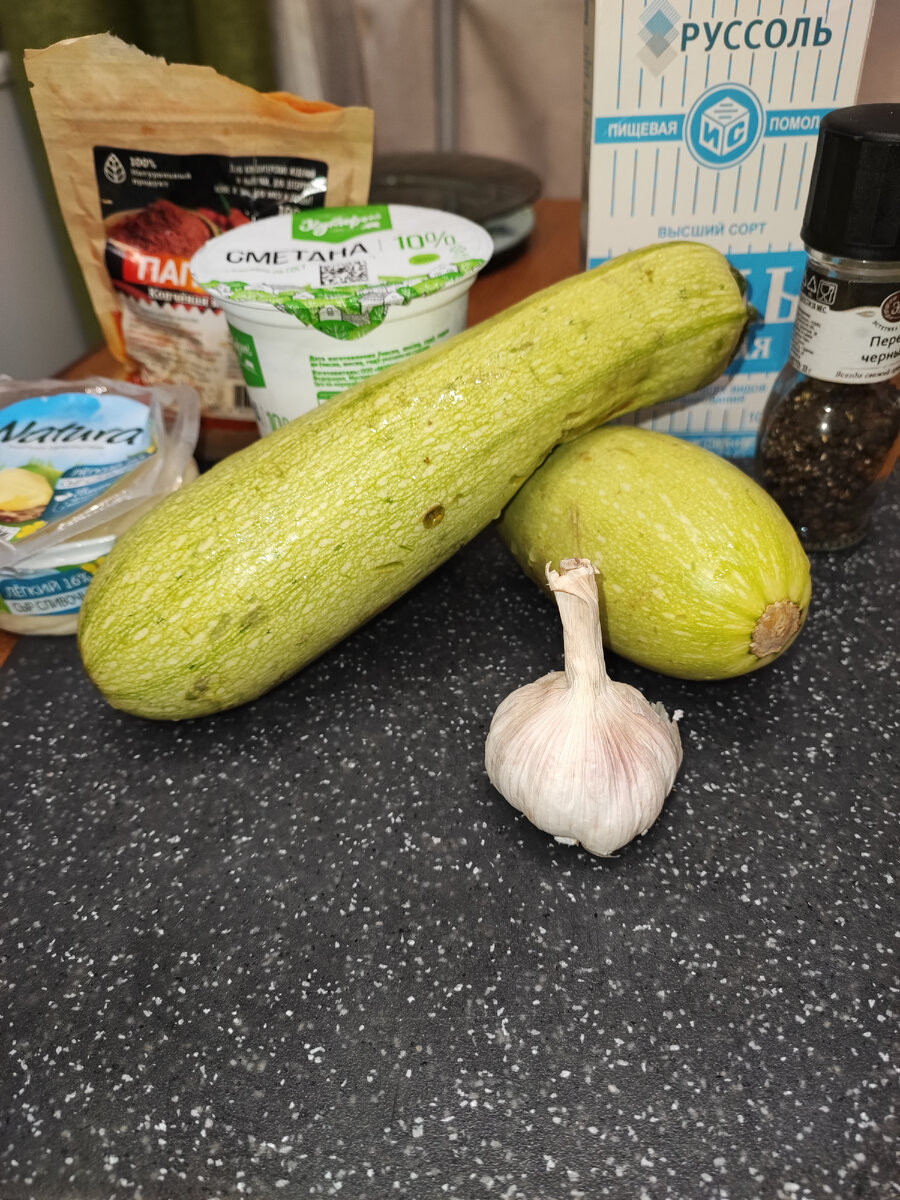 Здравствуйте, друзья! Кабачки суперский продукт в плане контроля веса. Да вот засада - сырыми их не слопаешь. Надо готовить. Любимое моё : кабачки обваливаем с муке, жарим на масле и подаём с соусом из майонеза (или сметаны) с чесноком. Вкусно? Естественно! Калорийно? Запредельно! Что же делать? Сейчас расскажу. Собственно, приготовим необходимые ингредиенты. Кабачки, сметана, чеснок, соль. Остальное по вкусовым предпочтениям - у меня перец, паприка и немного сыра. (В конце будет калорийность блюда) Всё просто как белый день. Кабачки рубим кружочками (это про молоденькие, со стареньких придется и кожуру снять и семена вынуть) и присаливаем, с целью отделения лишней влаги. Параллельно готовим соус из сметаны и чеснока (ну и что вы ещё решили добавить) Кабачки выкладываем в форму. Я маслом не смазывала вовсе. Ничего не пригорело (спойлер) Примерно так. В один слой. Сверху вымазываем соус (сынулька мой кулинар 😁 помогал) Хорошенько это всё размазываем и отправляем загорать в духовку. Я о