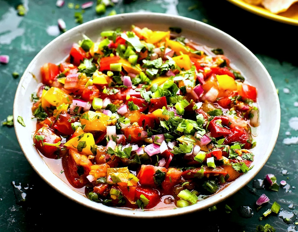 ИНГРЕДИЕНТЫ: 500 г томатов, 0,5 красного лука, 1 небольшой перчик чили, сок 1 лайма, 15 кинзы, 1 зубчик чеснок, соль.