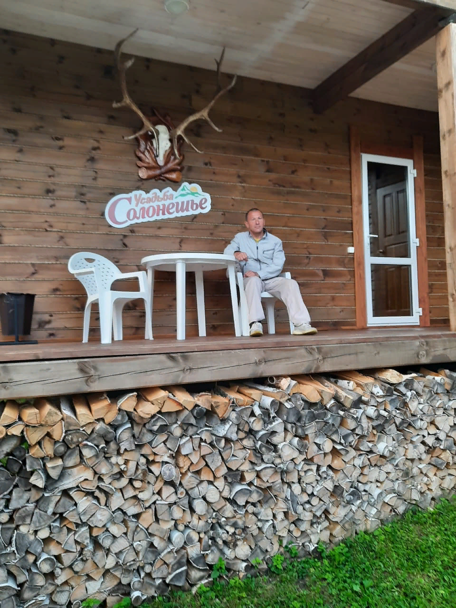 Через 4,5 часа мы, наконец, прибыли на усадьбу «Солонешье», которая расположена вдали от суеты и гула машин, практически в чаще леса. Температура поднялась до +20 градусов, светило солнце. Меня встретил хозяин усадьбы, приятный на вид и очень добродушный человек. Я осмотрелся, вокруг возвышенности и среди них стоят деревянные дома, в которых размещены администрация, гостевая, процедурная, столовая и дом для персонала. Здесь нет интернета, нет вотсапа и не работает даже телефон. Правда, есть сотовый телефон в столовой, по которой можно позвонить в случае необходимости. На небе кружат коршуны, кукует кукушка, поют птицы и рядом журчит небольшая речушка Тальменка. Местные говорят, что здесь водится очень красивая рыба хариус, очень вкусная, практически деликатес. На территории усадьбы очень много бабочек, различных расцветок, которые тучами кружат в поисках драгоценного нектара. Меня разместили в одноместном номере деревянного двухэтажного дома, где все сделано из дерева, даже урна. Такая рациональная экологическая политика хозяина усадьбы меня обрадовала. Туалет, ванная, душ, телевизор, короче, все необходимое для полноценного отдыха. Удивительно то, что в процессе отдыха мы ни разу не включали телевизор. Другими словами, просто отдыхали в тишине от цивилизации. В зале и в прихожей чучела диких животных. На полу в прихожей шкура волка, а в зале шкура медведя. На столе стоит стеклянная банка с пихтовой водой, полезной и приятной на вкус, так, что любой желающий в любое время может утолить жажду. Другими словами, настоящий охотничий домик.