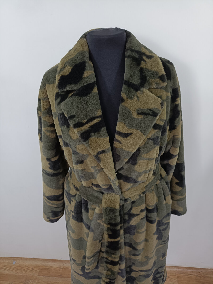 Судите сами, что именно я сшила. Работой этой я очень довольна (что бывает достаточно редко 🤭). Вот, полюбуйтесь сами: Мне очень нравится , как стыкуется рисунок на соединительных швах - словно кто-то подгонял его. А вот и главный секрет и интрига этого пальто (или шубы?) - ассиметричная шлица! Как вам идея? Тысячи мелких ручных стежков, припуски каждого шва подшиты вручную, чтобы вещь смотрелась максимально аккуратно 🤗 Любуюсь со всех сторон: В боковых швах выполнены карманы. Большие и вместительные, по просьбе заказчицы. Шлевки для пояса - отдельная история. Нитки для выполнения этих шлевок - суперпрочные, руками разорвать невозможно! А воротник! Воротник отлично держит форму, при этом сохраняя мягкость меховой основы. Всё потому, что я вручную продублировала его не совсем обычной прокладкой. Бязь, проклеенная пальтовым дублерином 😊 Думаю, это всё-таки больше шуба, чем пальто. По крайней мере , такой вывод напрашивается при виде шубных крючков. Крючки цвета хаки покупала