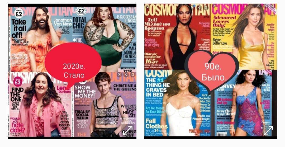 Но думаю, что со временем их станет гораздо больше. Функция этого журнала еще долгое время была такова, что он помогал женщине вдохновляться, открывать для себя новый мир, стремиться к лучшему, тянуться за теми успешными женщинами, чьи истории публиковали в Космо. А сейчас? Кого это вдохновляет? Кому-то хочется быть похожей на полную женщину на обложке, которая кричит в журнале что она счастлива, потому что приняла свое тело, и не хочет ни шагу сделать к обретению здоровья? Или на бородача в женском платье? Мне - точно не хочется.