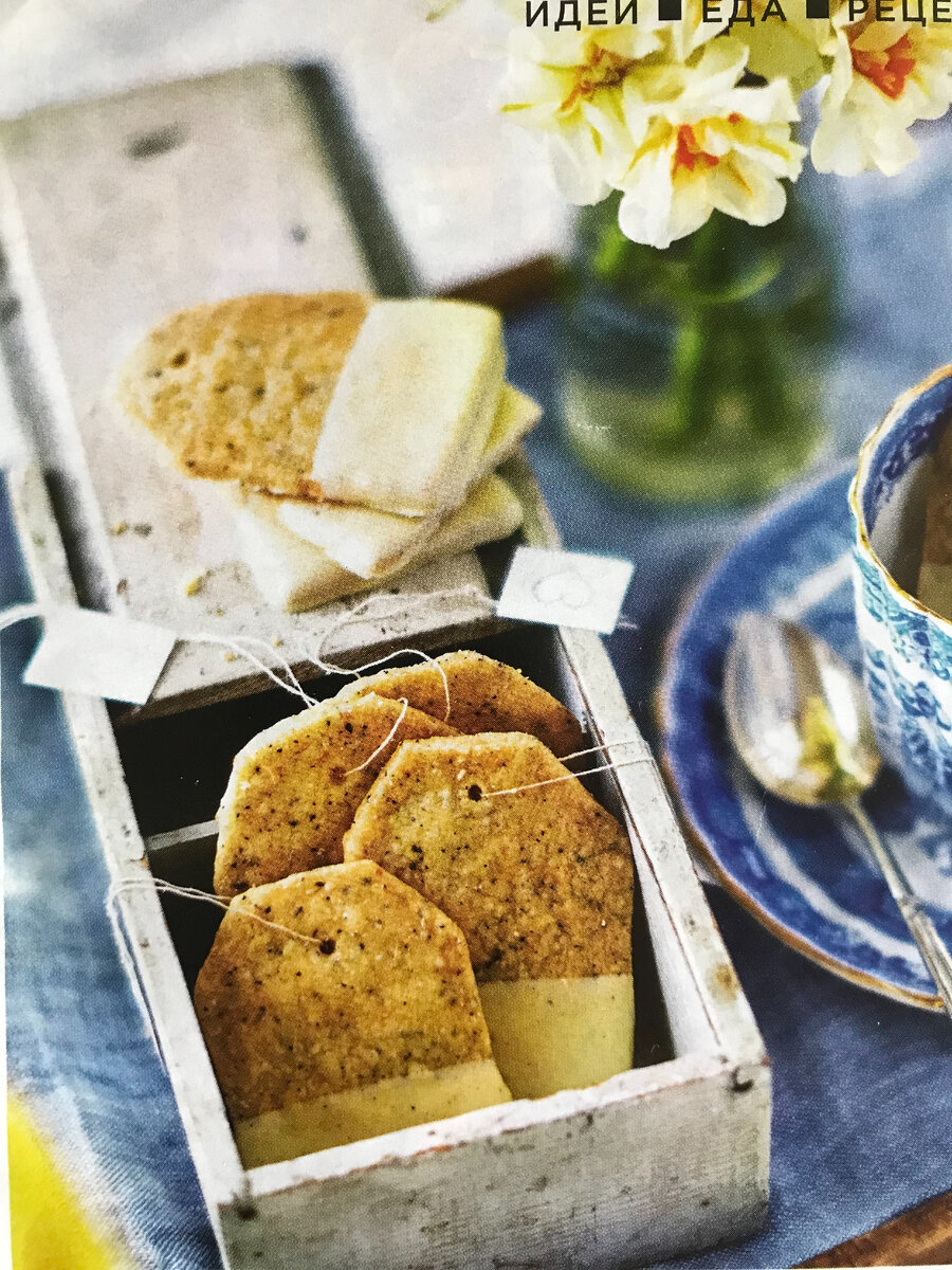 Давно хотела испечь это печенье по рецепту журнала "Домашний очаг", и вот наконец-то это сделала. Поделюсь результатом, своими впечатлениями. Зацепило меня в рецепте креативное оформление и использование чая с бергамотом. Очень люблю запах, вкус бергамота. Сразу скажу, что печенье получилось потрясающе вкусное и очень нежное. Тесто делала по рецепту (+ добавила ещё к лимонной цедре и апельсиновую). Тесто формируется хорошо и без блендера в шар, получается мягкое, эластичное. Чтобы было легче работать, холодное масло натереть на тёрке, окуная его в муке. Чтобы сделать из него форму чайных пакетиков лучше раскатывать на пергаменте и всё-таки предварительно охладить. Тесто очень нежное. Я решила сделать по-другому (не люблю кучу обрезков, спасовала)и чтобы легко ему придать нужную форму, выложила в небольшую прямоугольную форму с антипригарным покрытием, завернула в пищевую форму и убрала в морозилку на 20 минут. Так оно легко резалось фигурным ножом. Форма хорошо держится, печенье