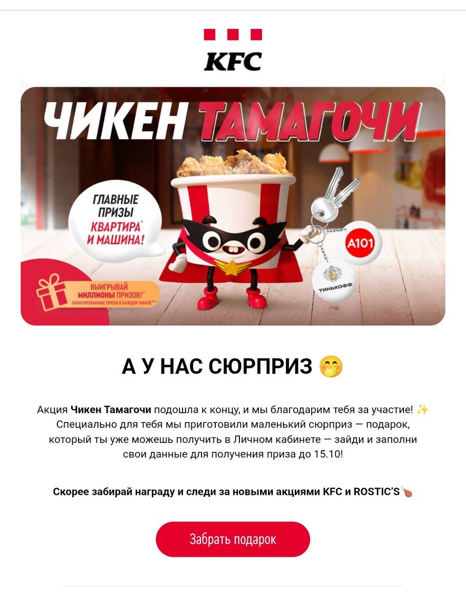 Добрый день, друзья! Недавно в KFC проходила акция "Чикен Тамагочи" нужно было выбрать героя и делать заказы через приложение. Я оформила два заказа и дошла до 2 уровня. Но потом благополучно забила на эту акцию, потому как стало не возможно оформить заказы через приложение, и я оформляла их напрямую через кассу, а это под акцию не подходит🤷♀️ А ещё больше половины блюд на время проведения акции не было в наличии И вот прилетело это письмо с "сюрпризом ", что за сюрприз такой тщательно скрывают. Для получения попросили почтовый адрес, значит приз физический. Учитывая, что он маленький, наверняка брелок какой-нибудь)) Но всё равно я заполнила все данные для отправки приза. Обещали отправить до 31 октября. Обязательно поделюсь потом, что пришло, если придет вообще))) Вы участвовали в этой акции? Что-нибудь выигрывали? Двое моих знакомых в этой акции получили 1000 и 3000 на карту Тинькофф, тоже не плохо)