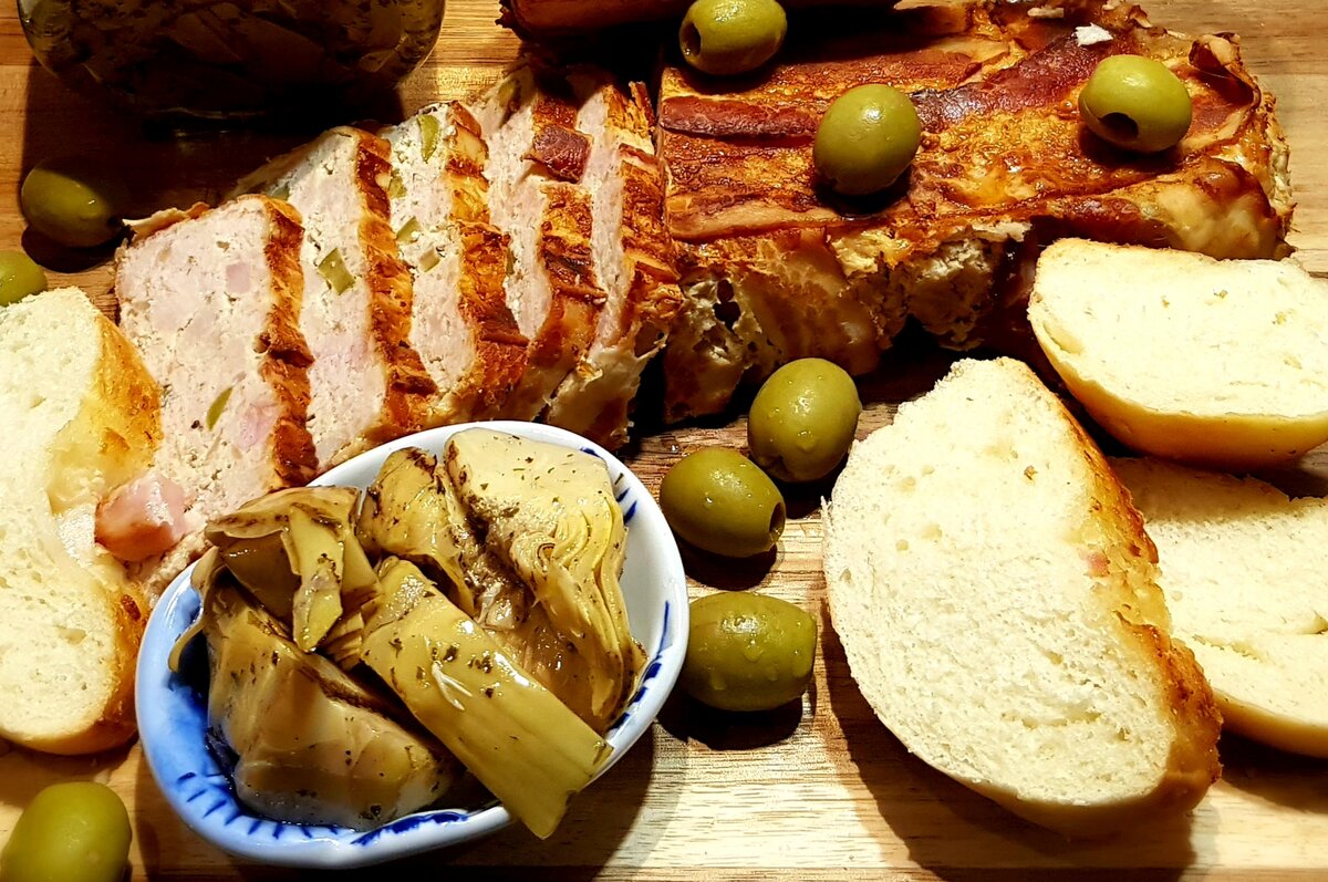 Террин из кролика с оливками и артишоками.