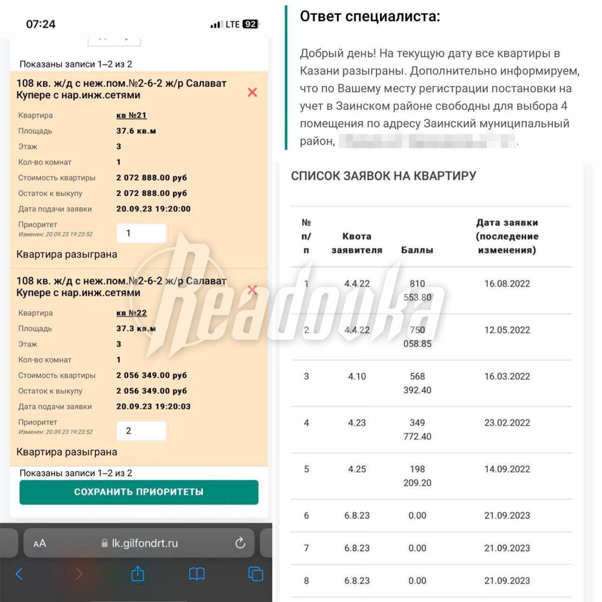 Readovka уже рассказывала историю Дамира — сироты и добровольца СВО из отряда БАРС-16, который не может получить квартиру на протяжении восьми лет из-за бюрократической системы. Квартиры, по сути, предлагают, но только в районных городах, но не в Казани, как обещают. После публикации материала в апреле ситуацией заинтересовались в региональном СК, даже связались с Дамиром и попросили написать его заявление в суд. Он все выполнил, но дело так и не сдвинулось с мертвой точки. Местные жители обратили внимание, что на сайте «Государственного жилищного фонда» квартира, допустим, в Набережных Челнах может висеть более трех месяцев и не быть «разыграна». Однако в Казани не проходит и дня, как льготное жилье оказывается «разыграно». Странно то, что объявление о квартире не исчезает с самого сайта, и люди фактически могут подавать на него заявку. «То есть такое ощущение, будто они заранее "разыграли" квартиру кому-то из своих людей», — рассказали льготники. Дамир неоднократно пытался дозвони
