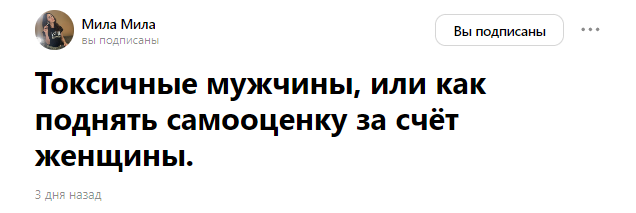 Предыстория: Некая неострая недоблогерша Мила Мила решила раскрутиться в Дзен, для рекламы своего сервиса по наращиванию ресниц. А как это сделать если ты никто и ничего из себя не представляешь, да и писать особо не о чем ? Правильно, нужно писать провокационные статьи на всякие острые темы. Например о взаимоотношении полов. И решила Мила качать повестку именно в эту сторону, опираясь видимо на свою крайне неудачную личную жизнь и обидки на мужчин. Начали выходить эпотажные статьи про неудавшиеся свидание, где ей королевне не угодили, приехали на СТАРОМ АВТОМОБИЛЕ !!! и не поехали туда где за парковку 500р платят; про секс 3-минутки; про то как продавщицы в магазине женского белья посмели считать что его покупают для мужчин !! и т.д. В ответ на это закономерно стали появляться комментарии, которые намекают авторке, что вся её писанина это немного чушь, либо выводы совершенно некорректны. но авторка оказалась совсем непробиваемая и любую критику воспринимала в штыки, считав что ей