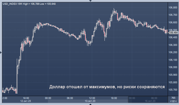 Из-за эскалации военного конфликта ставки на активы-убежища остаются повышенными График индекса доллара интервалами в 15 минут Доллар отошел от максимумов на азиатских торгах в понедельник, но удерживался на повышенных уровнях из-за эскалации напряженности на Ближнем Востоке, и инвесторы ожидали подсказок о перспективах процентных ставок в США из выступления председателя Федеральной резервной системы Джерома Пауэлла позднее на этой неделе. Доллар оставался вблизи недельного максимума по отношению к евро и фунту стерлингов, поскольку отношение к риску оставалось неустойчивым. В последний раз евро поышался на 0,13% до $1,05265, опустившись в пятницу до недельного минимума в $1,0496. Фунт стерлингов вырос на 0,13% до 1,2160 доллара, стабилизировавшись выше недельного минимума пятницы в 1,2123 доллара. Индекс доллара упал на 0,07% до 106,49. "Я рассматриваю происходящее в Израиле как региональный конфликт, который, как правило, не оказывает существенного влияния на финансовые рынки с течен