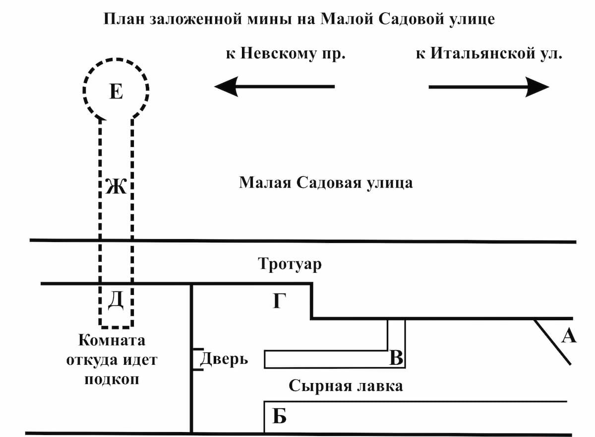 4 марта дворник дома графа Менгдена находящегося на углу Невского и Малой Садовой, того самого в котором находилась вышеупомянутая кондитерская, заявил, что содержатель «сырной лавки» с женою скрылся, а в самой лавке обнаружена земля и инструменты для земляных работ.