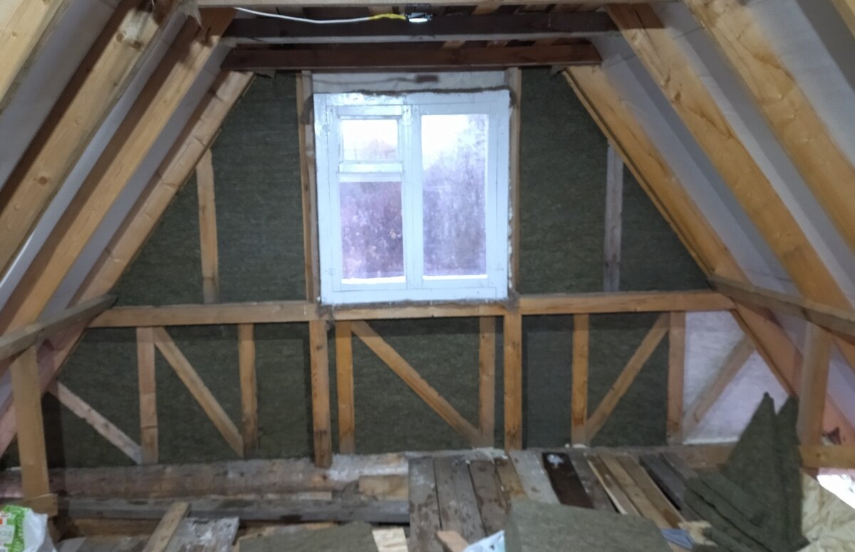 Погода испортилась, дождь загнал меня под крышу. Итак, начал утеплять фронтон. В качестве утеплителя выбрал ИЗОВОЛ СТ50.