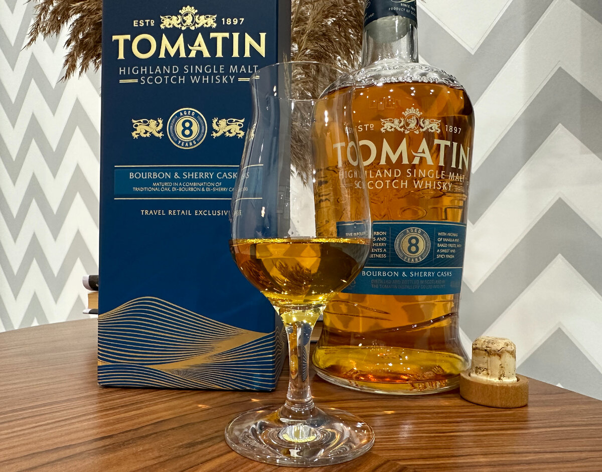 Приветствуем Вас, дорогие друзья! Сегодня поговорим о виски, который хоть и является дьютифришным эксклюзивом, но тем не менее какими какими-то окольными путями сумевшим добраться до сети магазинов Лента, где и попал в наши цепкие руки. Встречайте Tomatin 8, сингл молт в мощной литровой бутылке. О производителе Прежде всего о названии. Tomatin (что на гэльском Tom-aiteann) можно вольно перевести как холм можжевельника. Компания The Tomatin Spey District Distillery была зарегистрирована 8 июня 1897, однако уже в 1906 году была ликвидирована. Тем не менее, уже в 1909 была повторно открыта под названием The New Tomatin Distillers Company Ltd. В 1956 году производство было расширено с двух перегонных кубов до четырёх, и на этом расширение не остановилось! Ещё два куба было добавлено в 1958, четыре в 1961, а в 1974 добавили сразу двенадцать! К этому времени Tomatin стал самым большим производителем молтов с мощностью в 600 тонн в неделю. Но всему хорошему рано или поздно приходит конец и