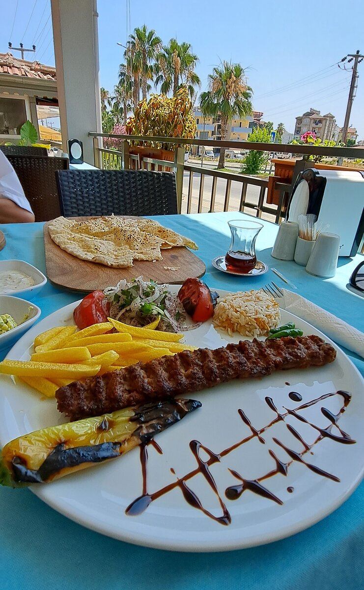 Всем привет! Как и обещала обзор кафе и цен в Сиде, по дороге к Античному городу! Находится оно возле такой вот площади или кольца. Эта кафешка нас спасла от голода, т.к. она первая толковая попалась на нашем пути, где можно поесть нормальной горячей еды. Сели мы на веранде. Вот меню, выбор приличный. Как мы и хотели в нём много турецких блюд. А вот с напитками выбора меньше, свежевыжатого сока не было, пришлось взять чай. Первым делом нам конечно же принесли вот такую лепёшку, воздушную и с тонким тестом. Очень вкусно. Возможно, у неё есть какое-то правильное название. В разных кафе приносят разные лепёшки, больше всего я люблю именно такую, на мой взгляд она более лёгкая. Ну и конечно же принесли соусы и острый перчик, который официант сорвал прямо на наших глазах с деревца, которое растёт у них в кафе. Перчик конечно острый, но он нам сразу сказал, чтобы мы ели только шкурку, тогда остро не будет, т.е. нельзя прокусывать перчик. А вот и Адана Кебаб, это люля с перчиком, перчик пика