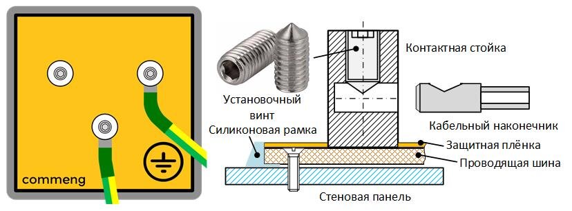 Шина заземления предназначена для выполнения электрического соединения проводящих частей с целью достижения равенства их потенциалов и обеспечения электробезопасности. В типовых размерах, определяемых размерами рамок для устройств COMMENG, могут быть изготовлены шины на 3, 6 и 9 подключений. Шина вместе с силиконовой рамкой крепится к поверхности (например к стеновой панели), и подключается к системе заземления с тыльной стороны, для чего там выполнен болтовой контакт. После крепления на поверхность шины наклеивается защитная плёнка, имеющая три отверстия для контактов. Для шины разработаны контактная стойка и кабельный наконечник, выполненные из нержавеющей стали. Для крепление к нему провода используется обжатие стандартным инструментом, после чего на место соединения одевается термоусадочная трубка. Используемая конструкция и материалы обеспечивают удобство монтажа и эксплуатации, надежный и стабильный во времени электрический контакт, соответствие требованиям к чистым помещениям