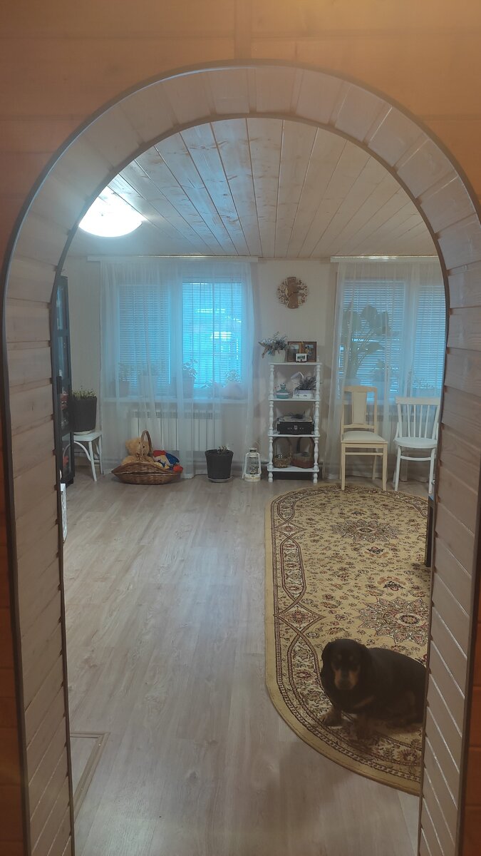 После чаепития приглашаю в мою гостинную, посидеть у камина. Она у меня получилась довольна большая, 6 на 6 метров. Делить на две комнаты не стали, чтоб могла собираться вся наша большая семья.Тяжёлые шторы я не люблю, поэтому на окнах в доме у меня жалюзи и органза. В этой комнате встретился винтаж- круглый стол, этажерка, стулья и современная Икея- шкафы и журнальный столик. Главная изюминка- камин. Спасенный стол. И спасённая этажерка, с утюгом, лампой и проигрывателем... Это наш любимый с Изюмом уголок. На полу его овчинка-подстилка. Картина- холст, масло, тоже спасённая, автор неизвестен. Вдохновения она у меня особого не вызывает, но не могла позволить знакомым отправить её в утиль. Кресло тоже старое, советское. Следующее помещение- самое нужное и комфортное. Санузел. Здесь всё самое необходимое. Весы на полу для меня, а горшок для племянников😂. Ну и без украшательств я не могу. Вот и конец нашей экскурсии. Осталась одна тайная дверь. 😊 Это кладовка. Там лежит всё
