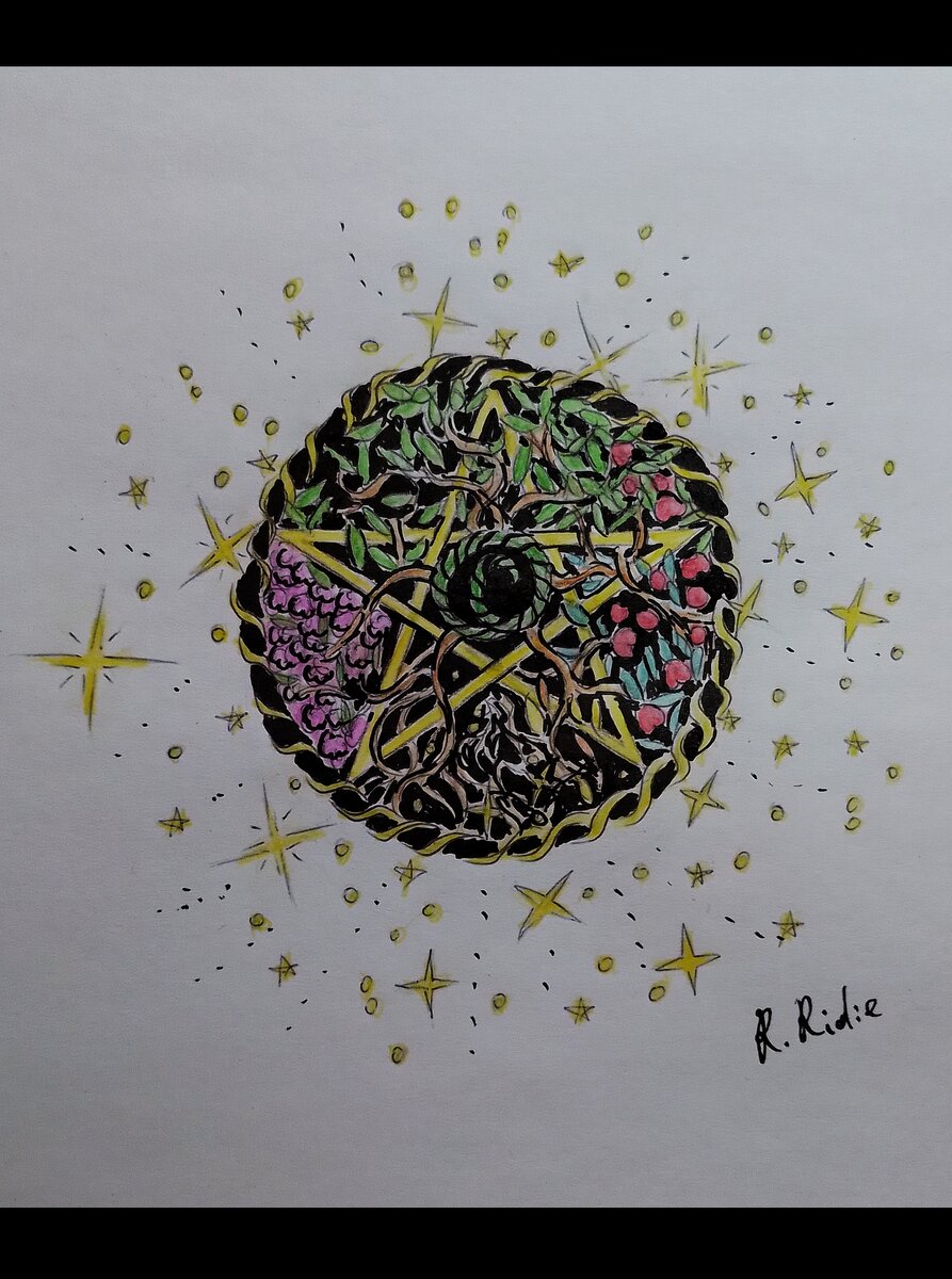 Искрящаяся пентаграмма, стилизованная под Колесо Года. "Сама́йн, Самхейн(англ. Samhain, гэльск. Samhuinn, ирл. Samhain— кельтский праздник окончания уборки урожая. Знаменовал собой окончание одного сельскохозяйственного года, и начало следующего. Впоследствии совпал по дате с кануном Дня всех святых, повлияв на традиции народно-католического праздника Хэллоуин. Один из четырёх главных праздников Колеса Года у виккан и кельтских неоязычников. Самайн отмечался как праздник начала нового года. В Ирландии и Шотландии его иногда называли «праздником мёртвых»: считалось, что в эту ночь умирают люди, нарушившие свои гейсы. Начинался праздник в ночь с 31 октября на 1 ноября, считавшимся последним днём сбора урожая. Традиционно на Самайн делили собранный урожай, а также решали, какая часть скота переживёт зиму, а какая — нет. Последнюю часть резали, чтобы сделать запасы на зиму. Во время празднования жгли костры. Друиды при помощи оставляемых огнём на костях убитых животных рисунков предсказыв