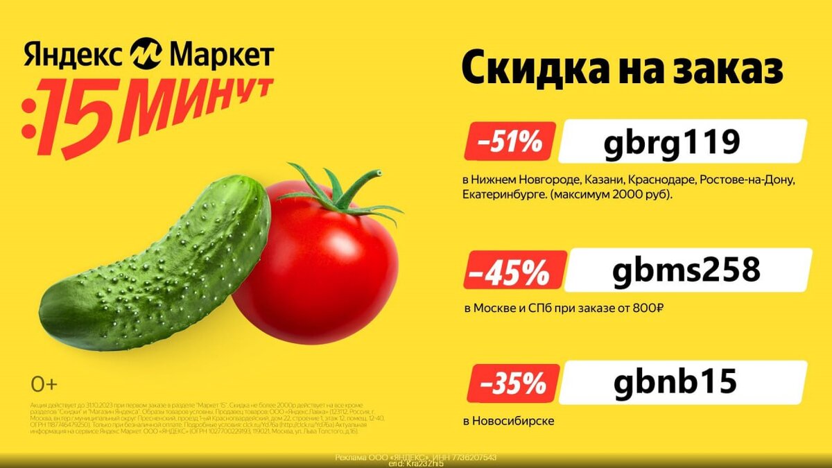 gbnb15 - скидка 35% при заказе в Новосибирске Яндекс.Маркет 15 предлагает новый уровень эффективности в доставке. Помимо скорости, сервис предлагает возможность экономии на первом заказе. Используйте промокод gbnb15 и получите скидку 35% на вашу первую покупку. Но обратите внимание: максимальная сумма скидки не может превышать 2000₽. Получи скидку на первый заказ по промокодам вы