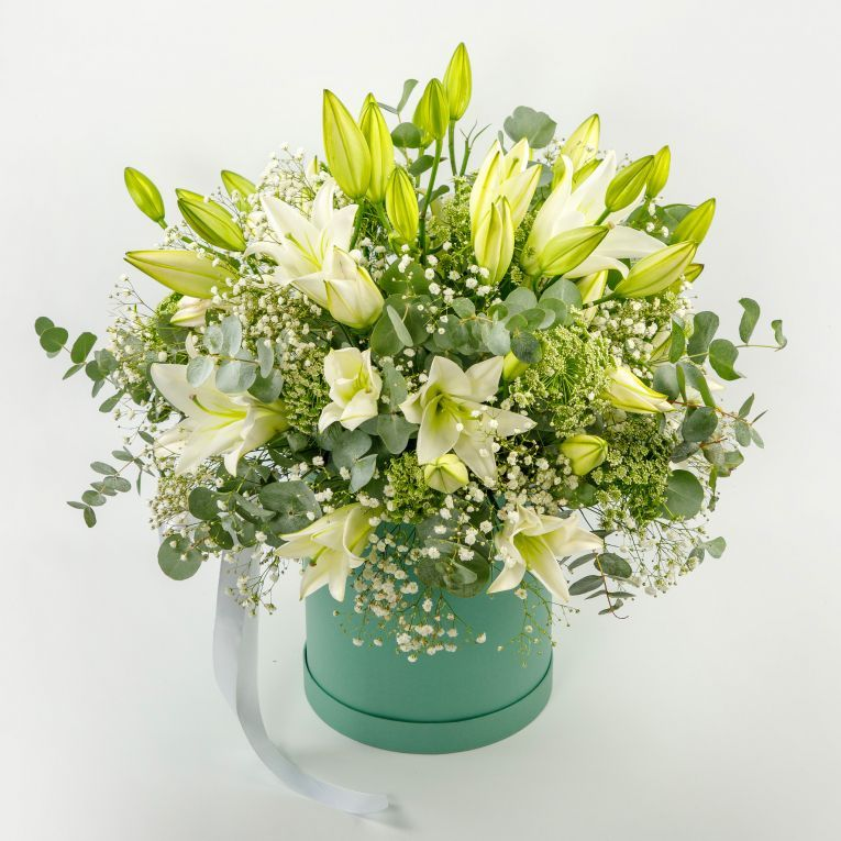 Великолепные лилии, словно лунные лучи, расцветают внутри бирюзовой шляпной коробки, придающей букету загадочности. Гармонично дополненный зеленью буплерума и ароматным эвкалиптом, букет вдохновляет своей стильной элегантностью.