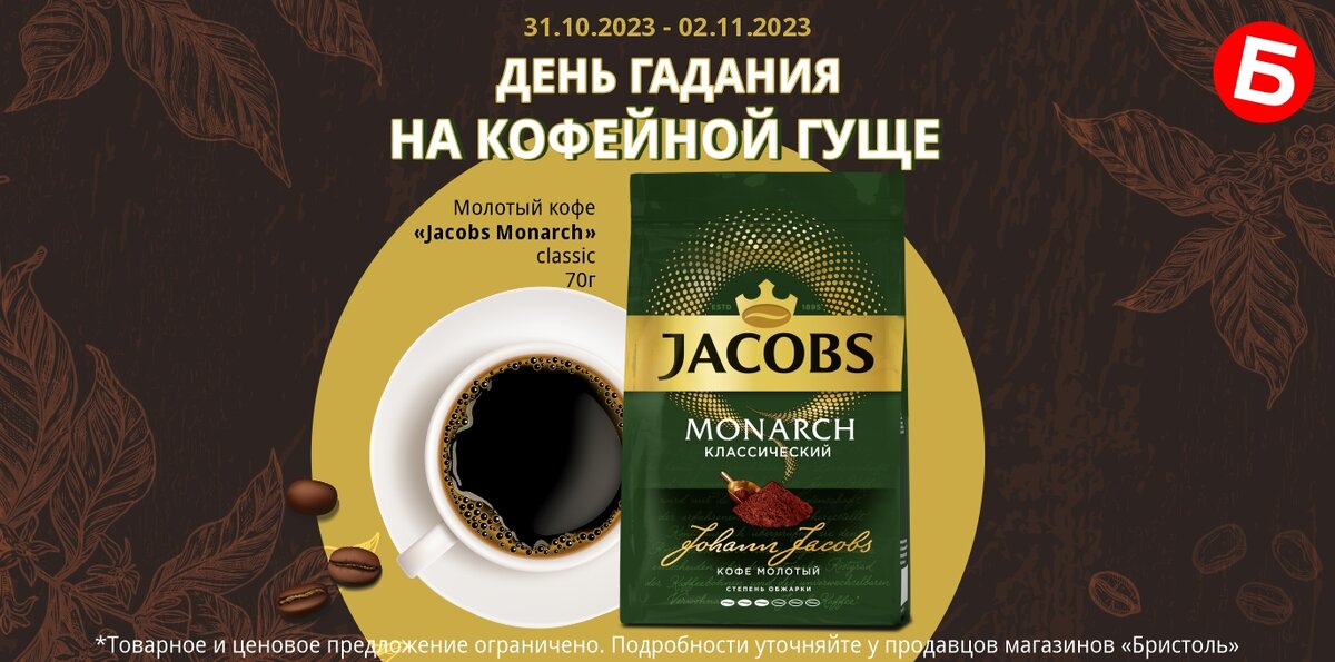 Есть у нас тут настоящие кофеманы? Кто начинает утро с бодрящего и насыщенного аромата свежесваренного кофе? Напитком насладились, а что делать с кофейной гущей? Можно погадать или использовать в других целях. Тем более 1 ноября отмечают День гадания на кофейной гуще! В честь этого в «Бристоль» действует скидка 15% на молотый кофе в период с 31 октября по 2 ноября 2023 года включительно! Пополняйте запасы выгодно! *Скидка действует не на все категории товаров, полный перечень товаров со скидкой - уточняйте в магазинах Бристоль; Откуда пошла традиция гадать на кофейной гуще? Традиция гадания на кофейной гуще имеет древние корни и связана с турецкой и арабской культурами. Считается, что она возникла в Средневековье, когда в Османской империи стали распространенными кофейные дома или «кафене», где люди собирались, чтобы пить кофе и общаться. Гадание на кофе стало популярным развлечением в этих заведениях, где с помощью «кофейных образов», оставленных на дне чашки, предсказывали будущее и