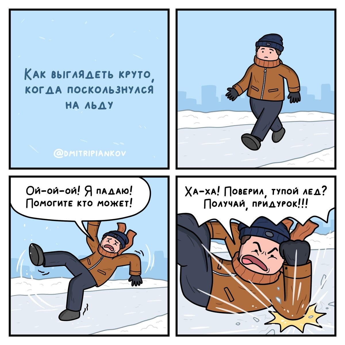 Ну что, вот и снова пришла зимняя пора - уже сегодня состоялось наступление календарной зимы, хотя в некоторых регионах снег уже давно успел выпасть, а температура понизиться ниже нуля. К приходу каждого времени года я стараюсь делать тематические подборки: юмор про погоду и сопутствующие ей занятия - это неисчерпаемые темы. Вот и комиксы про снег, лед, холода и всякие зимние развлечения, похоже, никогда не закончатся. Так что пришло время для очередной зимней подборки! Надеюсь, что она вам понравится. Начнем мы эту статью с парочки шутливых инструкций о том, как вести себя зимой. К примеру, новосибирский художник и стендап-комик Дмитрий Пьянков нарисовал комикс под названием «Как выглядеть круто, когда поскользнулся на льду». Нижегородская художница Яна Вятелень - создательница паблика Ивовый лес - рисует очень атмосферные комиксы про взбалмошного опоссума. В одном из небольших сюжетов этот персонаж решил выяснит, каким образом лучше передвигаться через снег. Серия Пёсий вой от новоси