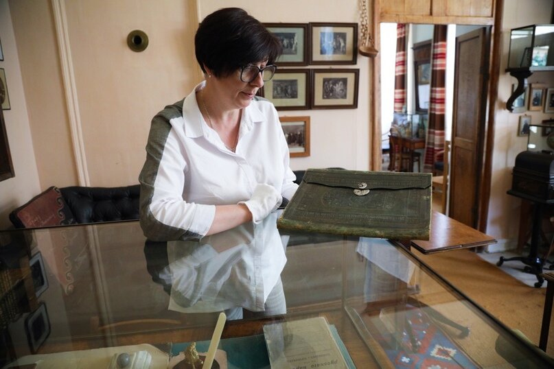 Рассказывая об экспонатах Дома Толстого, Надежда Валерьевна подчеркивает, что к любой мемориальной вещи надо прикасаться только в перчатках или предварительно обработав руки антисептиком.