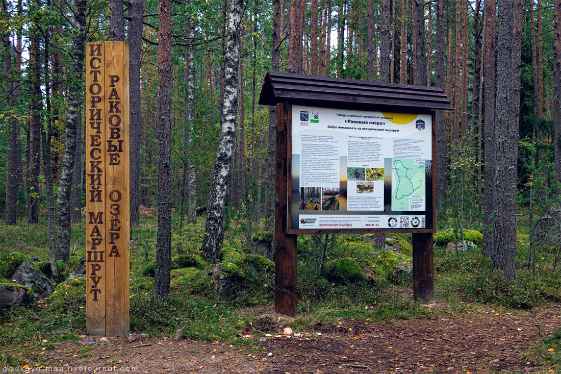 [30.09.2021] Немного не доезжая до основной экотропы у Раковых озер, находится ещё одна, покороче - исторический маршрут "Память Зимней войны". Мы вообще не собирались тут останавливаться, ехали дальше, к тропе на озёрах, но увидев из окна машины «зубы дракона», всё-таки решили сделать остановку. Поставленные торчком гранитные валуны - часть укреплений линии Маннергейма. На этом участке линии находился укрепрайон Муолаа, перекрывавший сушу между озерами Большое Раковое и Глубокое. Линия валунов прерывается автодорогой и продолжается на другой её стороне. Хорошо видна разница между расчищенной частью на той стороне где проходит экотропа и "дикой" частью в лесу: камни густо заросли мхом и папоротниками, повсюду бурелом. Возвращаемся к экотропе. Инфостенды на двух языках - финском и русском. Лес вокруг необычайно красивый. Вот тут непонятно, то ли это природный рельеф местности такой, то ли следы боёв. Здоровенная круглая ямища, метра два в глубину. Воронка? А грибов вокруг - хоть косой к