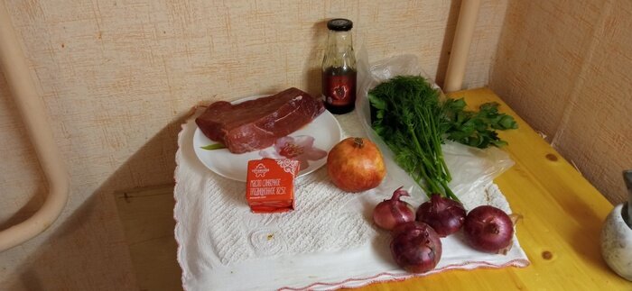 Закончилось мое 45-дневное турне по стране. Привез три рецепта. Суп, салат и мясо. Все, как ни странно, с Урала. Хотя думал, что Астрахань и Ростов на Дону порадуют более изысками. Сегодня мясо. Телятина по-домашнему. Почему раньше я не знал такого простецкого рецепта, я не знаю) Хотя это была моя 5 поездка на Урал. Итак нам надо: Телятина 700 грамм. Можно баранину, или уж совсем постную свинину. Лук (у меня розовый, не потому-что выпендрон, а потому-что со своей дачи) 350 грамм. Берите белый или репчатый, не ошибетесь. 3. Гранатовый соус Наршараб 3 столовые ложки. Вот тут строго. Никаких Сацебели и Ткемали. 4. Масло сливочное 80 грамм. Чем жирнее масло тем лучше. 5. Зелень (петрушка и укроп) и зерна граната для украшения блюда. 6. Соль и перец по вкусу. 7. Вода для ошпаривания мяса -1 литр, для тушения - 0, 5 литра. Приступаем. Мясо режем в размер куриного яйца, желательно вдоль волокон. В казан заливаем литр воды, подсаливаем немного, доводим воду до кипения ключом, вбрасываем мясо.