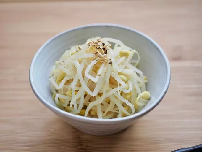 1 ст. л. кунжутного масла Приготовление: 1. Промыть и прочистить ростки, плохие убрать. 2. Вскипятить воду с солью в кастрюле и варить фасоль 1-2 минуты. 3. Затем опустить в холодную воду на 1-2 минуты. 4. Отжать ростки руками и заправить ингредиентами для соуса.