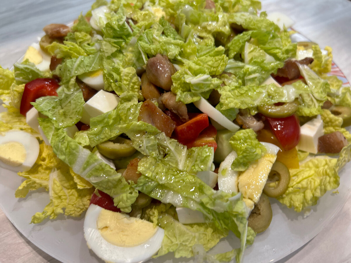 Когда была в отпуске, много лет назад, то решили с подругой поужинать в местном ресторане. И она посоветовала попробовать мне салат "Клео", что я и сделала, естественно его заказала. Кстати, он больше всего заинтересовал меня своим интересным названием и между прочим стоил он совсем не дёшево. Этот салат сразу стал моим любимым, с первого раза. Как только официант его принёс то была поражена его красотой и аппетитным видом. Но самое удивительное было то, как он вкусно сочетал различные ингредиенты. Это было что-то новое и необычное для меня. С тех пор он всегда радует меня своим вкусом, красотой и питательностью. И сегодня хочу поделиться с вами рецептом приготовления. 🔵 Давайте разберемся, что нужно для приготовления этого блюда Итак, вот список ингредиентов для салата "Клео": 🔹Свежие овощи (помидоры, огурцы, болгарский перец) - 0.200 грамм каждого; 🔹Зеленый салат, на любой вкус, экспериментируйте (лолло россо, руккола, листовой салат) - 0.100 грамм; 🔹Куриное филе - 0.200 грамм