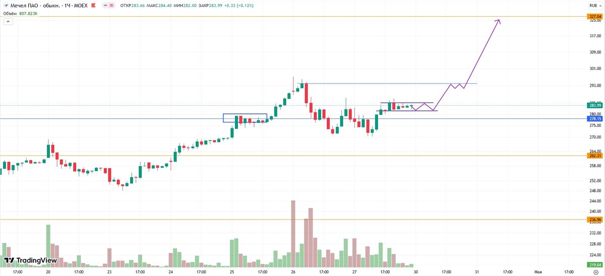 Мечел после недавнего падения отрисовал двойное дно и ушёл во флэт. Видимо некоторые крупные игроки решили закупиться в боковике и продолжить толкать цену наверх до следующего недельного уровня 327,04.