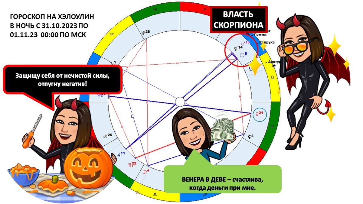 Итак, из вышесказанного ясно, что гороскоп в ночь с 31 октября на 1 ноября это магия и сила тёмных сил, стрессовые ситуации и денежные вопросы. Энергетика дня и ночи соответствует разгулу тьмы и дьявольским искушениям - будьте бдительны. Усугубляет негатив - лунное затмение в тельце от 28.10.23 читайте ЗДЕСЬ. Лучше провести это время дома и не идти на поводу у своей тёмной стороны души.