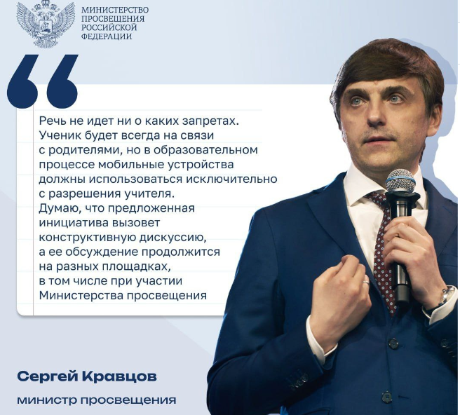 На сайте Министерства написано, что в Госдуму внесен законопроект, призванный повысить статус учителя, а также отрегулировать использование на уроках телефонов