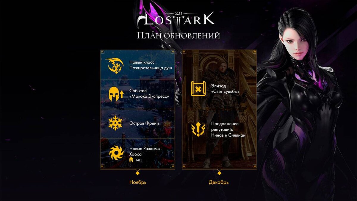 Издатель российской версии Lost Ark презентовал план ближайших обновлений, компания Astrum обещает добавить новый класс, новогодние ивенты и эпизод "Свет судьбы". Уже в ноябре стоит ожидать дополнение с новым игровым классом "Пожирательница душ", событием "Мококо Экспресс", тематическим островом Фрейи и новыми Разломами Хаоса. Декабрьский патч привнесёт сюжетное приключение "Свет судьбы", а также возможность прокачать репутацию с персонажами Нинав и Силлиан. План согласован с разработчиками из Smilegate RPG. Напоминаем, что недавно в игре установили обновление День сотворения с контентом и подарками в честь четвертой годовщины Лост Арк. Новость на сайте: https://top-mmorpg.ru/novosti-i-video-onlayn-igr/6673-v-lost-ark-anonsirovali-novyy-klass-pozhiratelnica-dush.html
