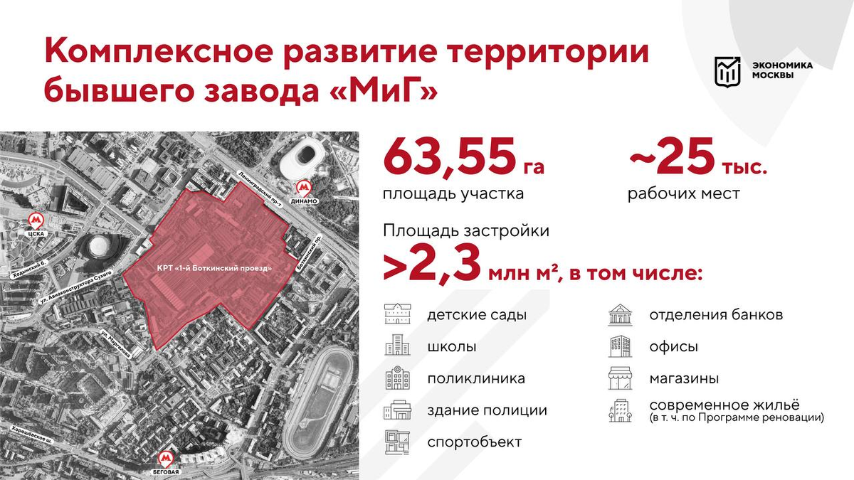 Москва заключила договор с инвестором о реорганизации территории бывшего завода "МиГ" в Беговом районе. Вместо устаревших объектов и недействующих производственных площадей построим современный городской квартал, в том числе для участников Программы реновации. Заключили договор с инвестором о реорганизации территории бывшего завода «МиГ» в Беговом районе. Возведем всю необходимую инфраструктуру: детские сады, школы, поликлинику, физкультурно-оздоровительный комплекс, магазины, офисы и другое. В итоге создадим около 25 тысяч новых рабочих мест, — сообщил в своем Telegram-канале мэр Сергей Собянин Реорганизация территории станет одним из самых крупных проектов в столице. Договор с инвестором заключили на 26 лет. Он вложит в проект не меньше 300 миллиардов рублей, при этом ежегодный бюджетный эффект для города составит примерно 12 миллиардов. Что известно о застройщике Площадка давно не использовалась для создания авиационной техники. В 2021 году территорию завода (три земельных участка