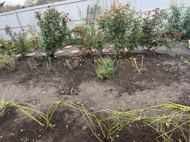 На конец октября основная масса роз у меня обрезана. Все английские розы связаны и пригнуты. Листва с них удалена. Лишние ветви удалены и вывезены с участка.