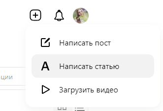 Этап 1. Откройте редактор для создания новой статьи: щелкните на иконку в верхнем правом углу и из выпадающего меню выберите опцию "Написать статью".
