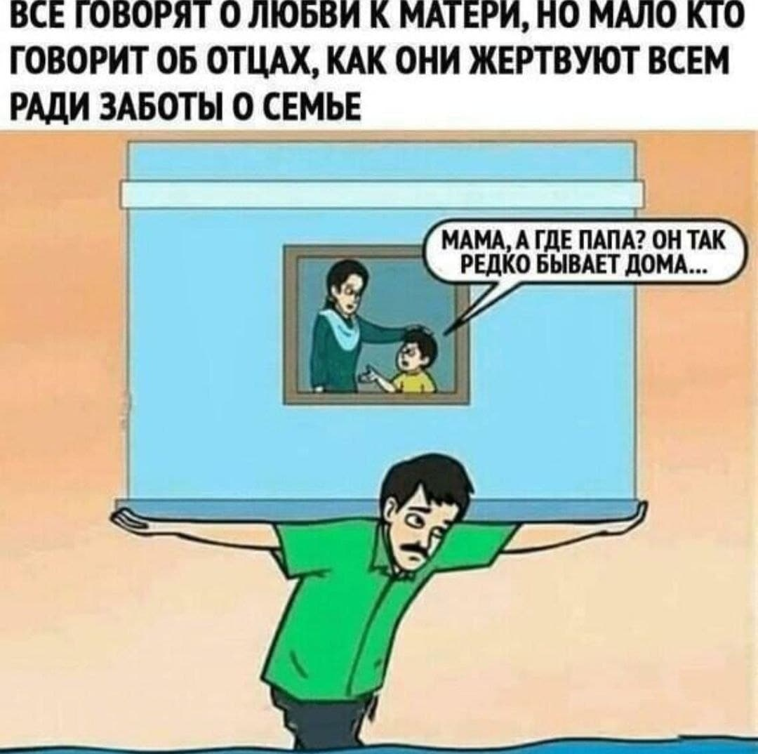 Конечно же, никто никогда не уточняет почему именно папа редко бывает дома. Может потому что у папы две работы? Папе плевать на своё здоровье, он добывает деньги любой ценой, а когда физически валится с ног и не успевает уделить внимание ребенку и жене, то папа становится плохой и невнимательный.